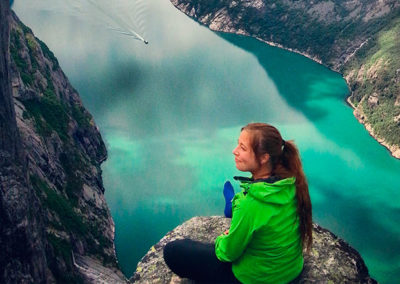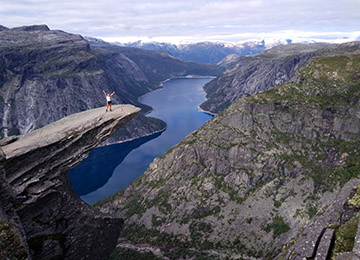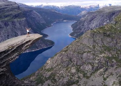 Oggi ci sveglieremo molto presto, in modo da poter fare la lunga ma bellissima escursione a Trolltunga, la “lingua del Troll”, un’insolita e affilata guglia di roccia che si protende sulle pareti del lago Ringedal, di colore blu. Scattare una foto sulla punta di questa formazione rocciosa è una delle immagini indimenticabili che fanno parte della lista dei desideri degli escursionisti di tutto il mondo. Per tutta la durata del trekking potremo ammirare gli splendidi panorami intorno a noi.